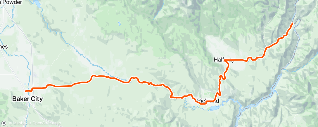 The route heads east from Baker City, then turns north. The landscape is large hills covered with sagebrush. The narrow valleys that have streams in them support irrigated agriculture which from my point of view looked mostly to be cattle ranching. You climb over Flagstaff Hill, with a good view back to the Baker Valley. The first town on the route is Richland, I stopped there for a snack. Right out of town is about an 8 mile climb, average grade 6%. It was exposed and with a headwind. On the other side you drop down to the Pine Creek Valley which contains the town of Halfway. There's a beautiful view of the Blue Mountains to the North. Still some snow on the tops. The route into Richland follows the Powder River, and you are again following the Powder River down its canyon to our stop for the night Oxbow; which is right on the Snake River.