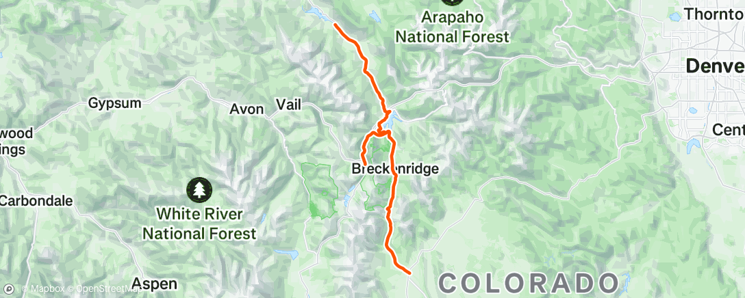 Then you pick up a bike path that takes you pretty much all the way to Breckinridge. In the process you climb up and cross the Dillon Dam that holds back the water of the Blue River to create Dillon Resevoir. I noticed that as I got closer to the dam, the bike path goes up a bunch of tight switchbacks at 5 -6%. That was kind of a kicker.