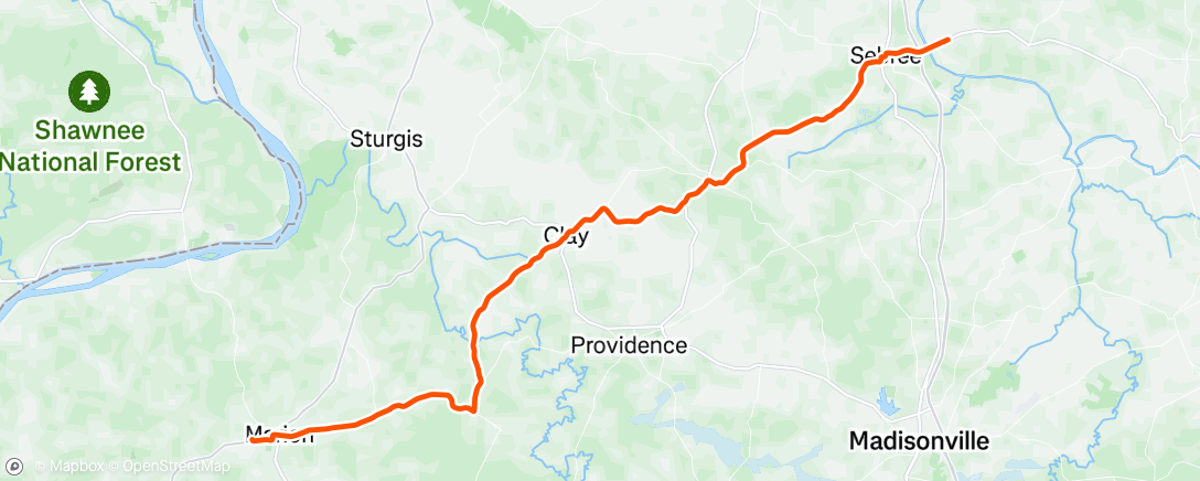We had a fairly intense thunderstorm last night, and the weather forcast was for rain today. It wasn't raining when I started out, and headed south from Marion then east. My route was closed due to a bridge out on rt 132, so I ended up with a few extra miles on the detour. Farm roads mostly, light traffic and good surface. No shoulder to speak of though. I stopped in the town of Sebree for a snack, then set off for my destination of Livermore. Not far out of town, the sky opened up and it poured for about 5 minutes, then rained steadily. I stopped and put on my rain gear, but got soaked in the process. My bike computer went crazy, and so I have an incomplete record of the trip. We're spending the night in Livermore, about 5 miles south of the TransAmerica trail that we have been following, but not bad for a RV park with full hookups.